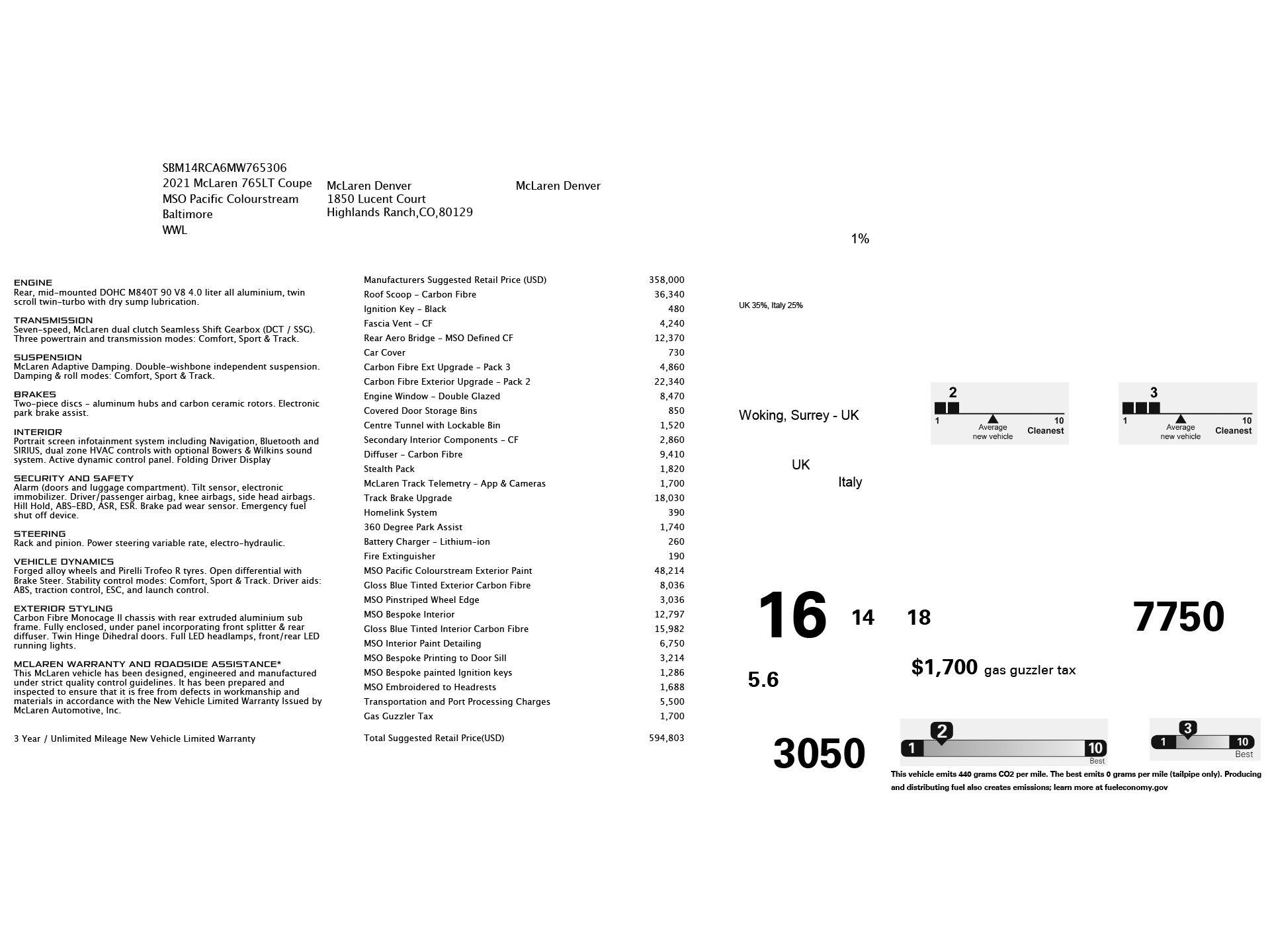 Certified. Pacific Colorstream 2021 McLaren 765LT RWD 7-Speed Manual V8 360-Degree Park Assist, Carbon Fiber Front Air Intakes, Carbon Fiber Front Splitter, Carbon Fiber Rear Bumper Lower, Carbon Fiber Side Skirts, Exterior Carbon Fiber Pack 2, Exterior Carbon Fiber Pack 3, Gloss Finish Visual Carbon Fiber Diffuser, Gloss Finish Visual Carbon Fiber Roof, MSO Defined Carbon Fiber Rear Aero Bridge, MSO Defined Carbon Fiber Roof Scoop, Navigation System, Track Brake Upgrade.Recent Arrival! Odometer is 2128 miles below market average!McLaren Qualified Details: * Limited Warranty: 12 Month/Unlimited Mile beginning when the two-year factory warranty expires * Vehicle History * 90+ Point Inspection * Transferable Warranty * Warranty Deductible: $0 * Roadside Assistance