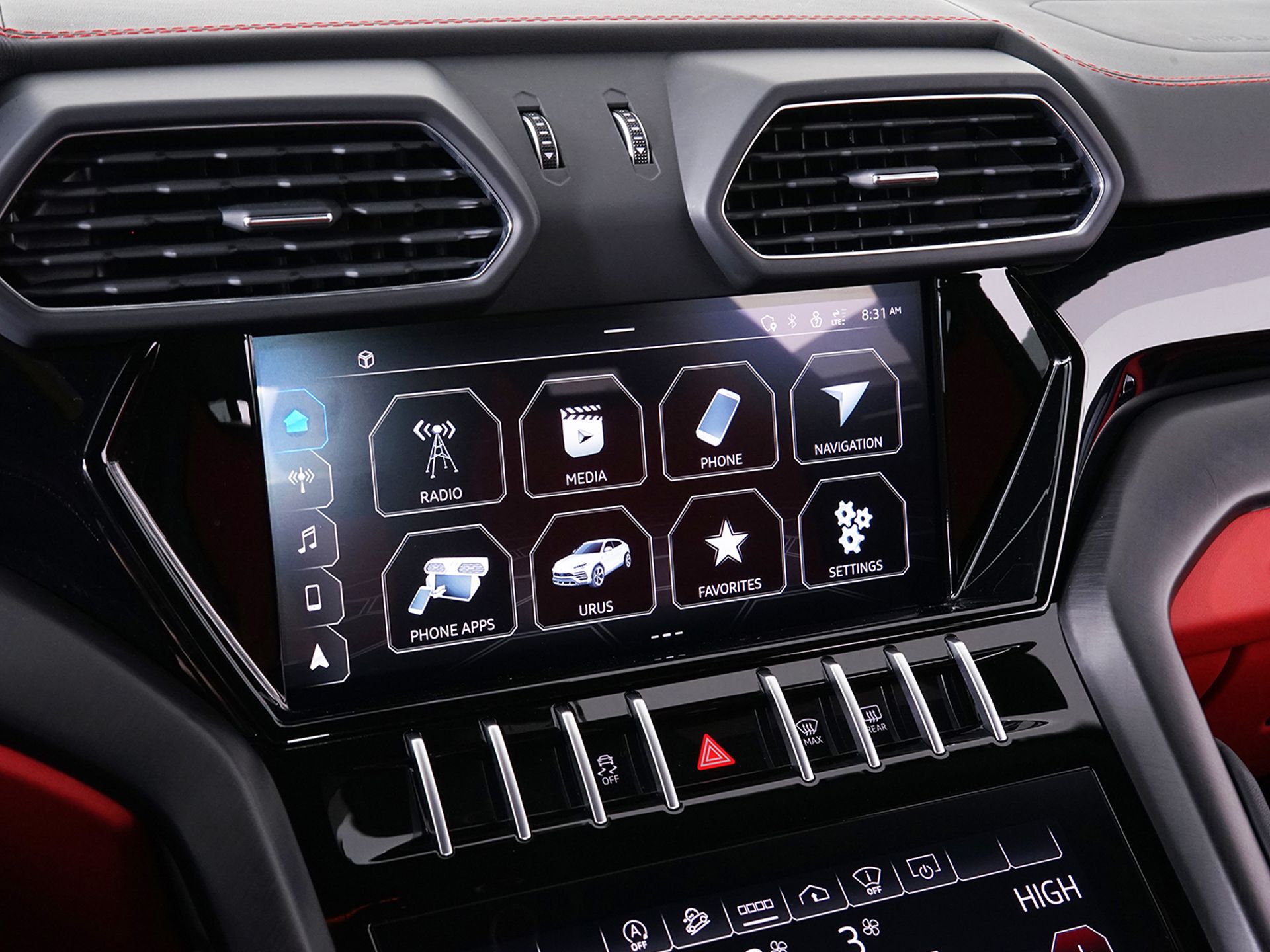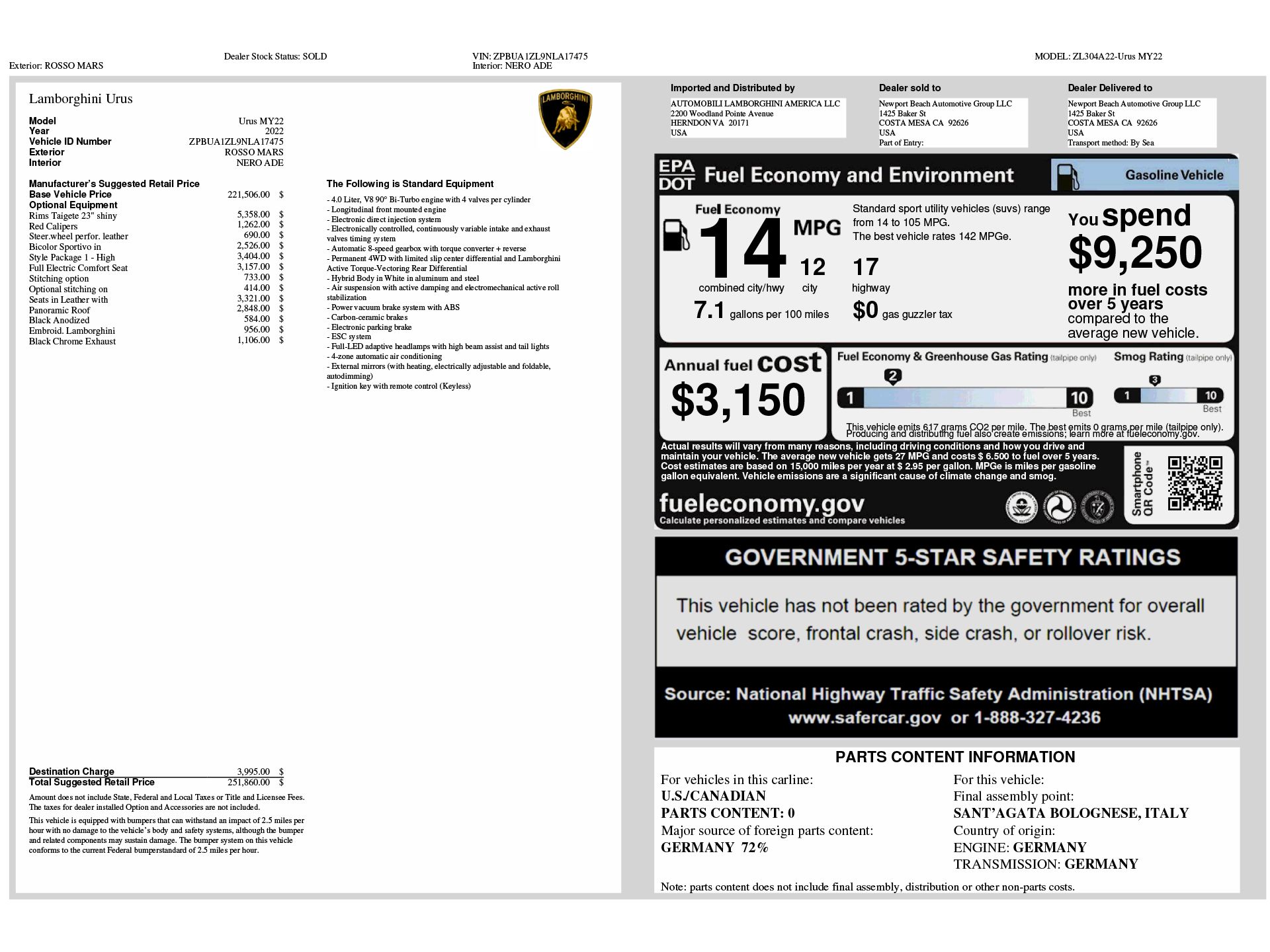 Certified. Rosso Mars Metallic 2022 Lamborghini Urus AWD 8-Speed Automatic V8 ABS brakes, Active Cruise Control, Adaptive suspension, Black Anodized Treatment on Aluminum Inserts, Black Chrome Exhaust Tailpipes, Brake assist, Compass, DVD-Audio, Electronic Stability Control, Emergency communication system, Exterior Parking Camera Rear, Front dual zone A/C, Heated door mirrors, Heated Front Bucket Seats, Heated front seats, High Gloss Black Style Package, Illuminated entry, Low tire pressure warning, Mirror Housings in High Gloss Black, Navigation System, Panoramic Roof, Power Liftgate, Rear dual zone A/C, Red Calipers, Remote keyless entry, Traction control, Wheels: 23" x 10J Fr & 23" x 11.5J Rr Taigete Shiny Blk.Recent Arrival! Odometer is 5499 miles below market average!