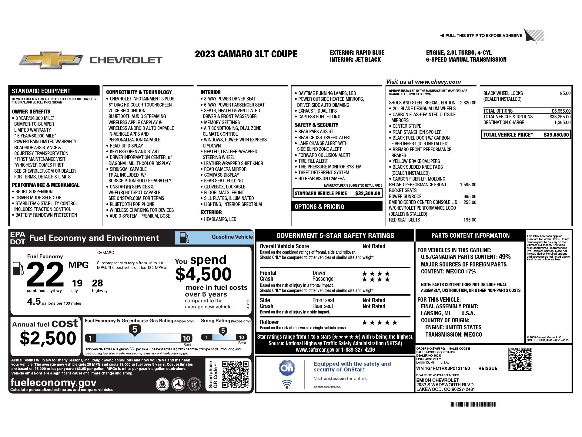 Rapid Blue 2023 Chevrolet Camaro 3LT RWD 6-Speed Manual 2.0L Turbocharged Apple CarPlay/Android Auto, Black Fuel Filler Door (LPO), Black Sueded Knee Pads (LPO), Brake assist, Brembo 4-Piston Front Performance Brakes, Carbon Fiber Instrument Panel Molding, Carbon Flash-Painted Outside Mirrors, Dark Tint LED Tail Lamps, Electronic Stability Control, Exterior Parking Camera Rear, Heated front seats, Leather-Trimmed Seat Trim, Leather-Trimmed Seat Trim w/Sueded Inserts, Power Sunroof, Rear Stanchion Spoiler, RECARO Performance Front Bucket Seats, RS Package, Shock & Steel Special Edition, Shock Center Stripe, Ventilated Driver & Front Passenger Seats, Ventilated front seats, Wheels: 20" Blade Design Aluminum, Yellow-Painted Calipers.Recent Arrival! 19/28 City/Highway MPG