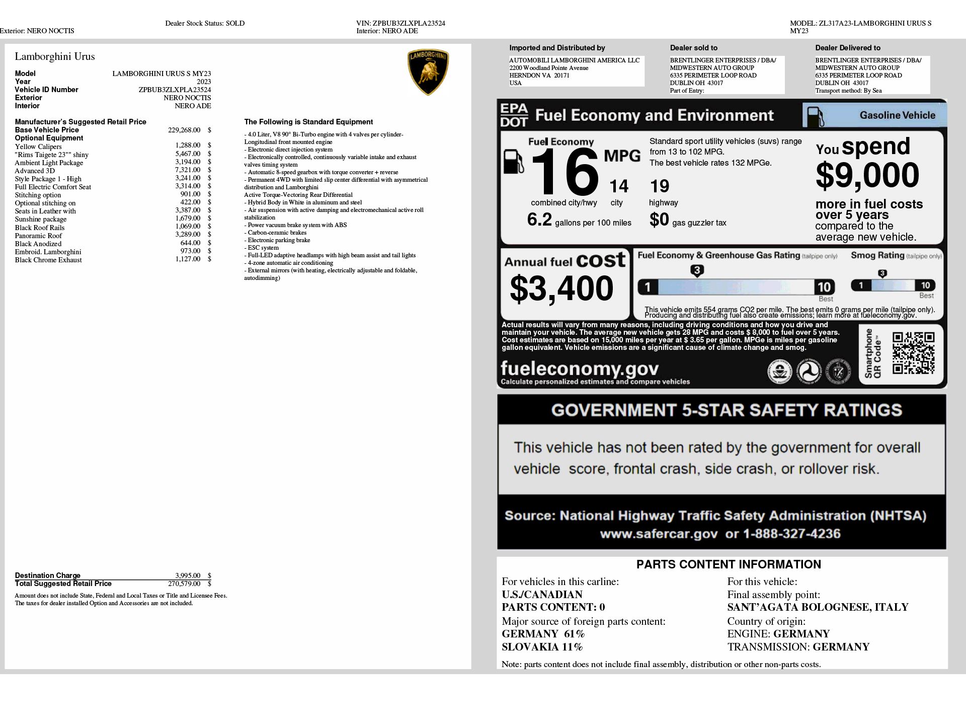 Certified. Nero Noctis Metallic 2023 Lamborghini Urus S AWD 8-Speed Automatic 4.0L V8 Twin Turbocharged Advanced 3D Bang & Olufsen Sound System, Ambient Light Package, Black Chrome Exhaust Tailpipes, Brake assist, Electronic Stability Control, Fully Electric Ventilated/Heated Front Comfort Seats, High Gloss Black Mirror Housings, High Gloss Black Style Package, Navigation System, Panoramic Roof, Power Liftgate, Wheels: 23" Taigete Shiny Black, Yellow Calipers.Recent Arrival!Selezione Lamborghini Certified Pre-Owned Details: * Limited Warranty: 12 Month/Unlimited Mile * Transferable Warranty * Vehicle History * Warranty Deductible: $0 * Roadside Assistance * 150+ Point Inspection